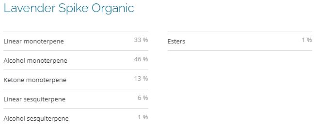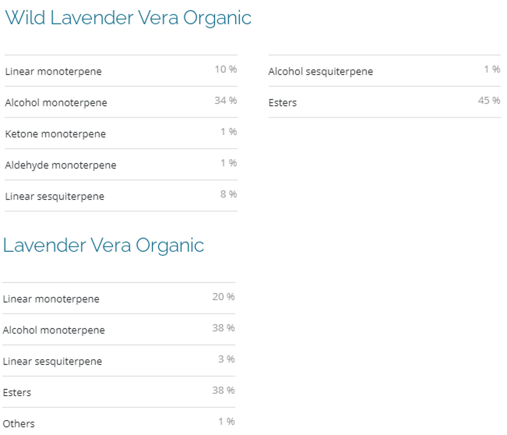 Biochemical profiles: According to their components, both varieties of lavender are rich in Esters with numerous benefits such as balancing and soothing, as well as in Alcohol monoterpene and Linear monoterpene, which are renowned as anti-infectious among other properties.