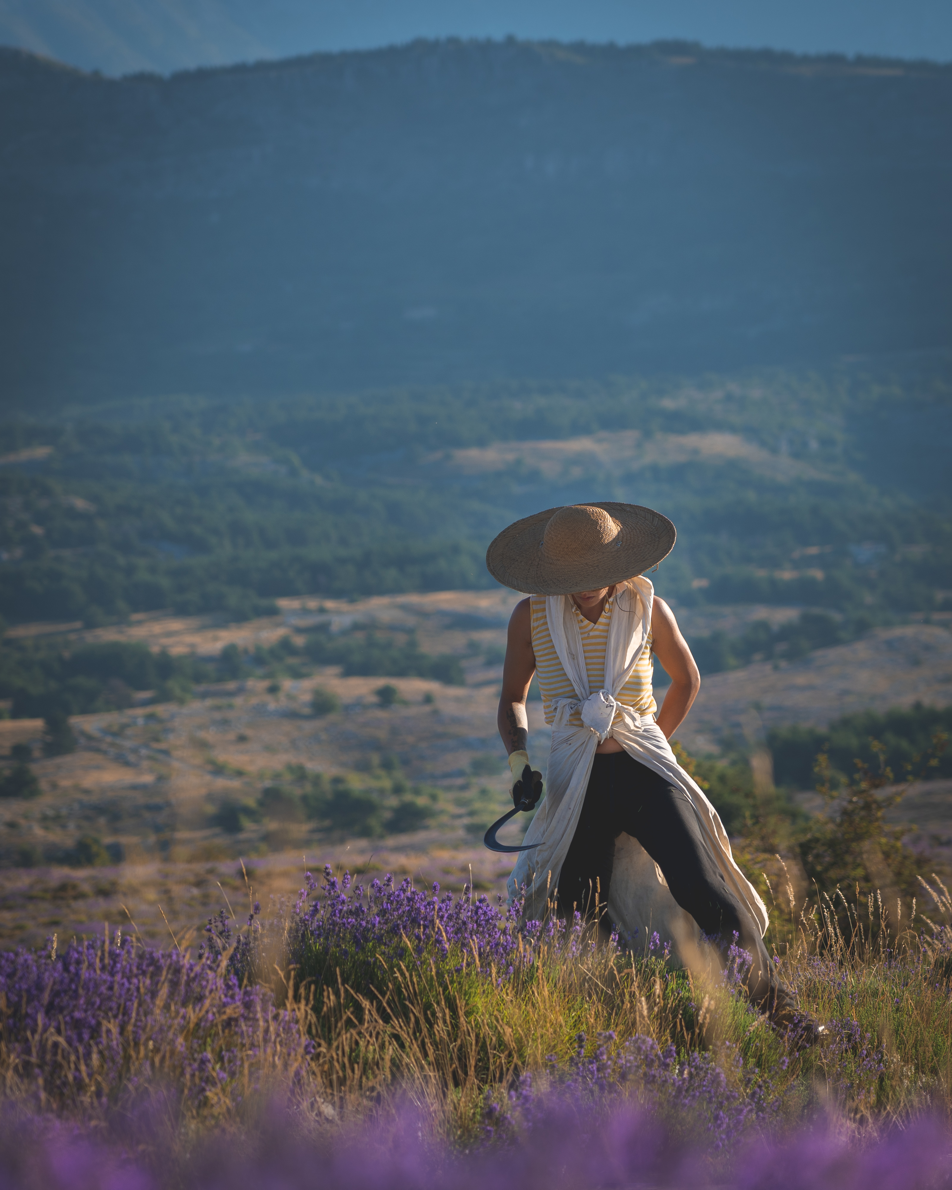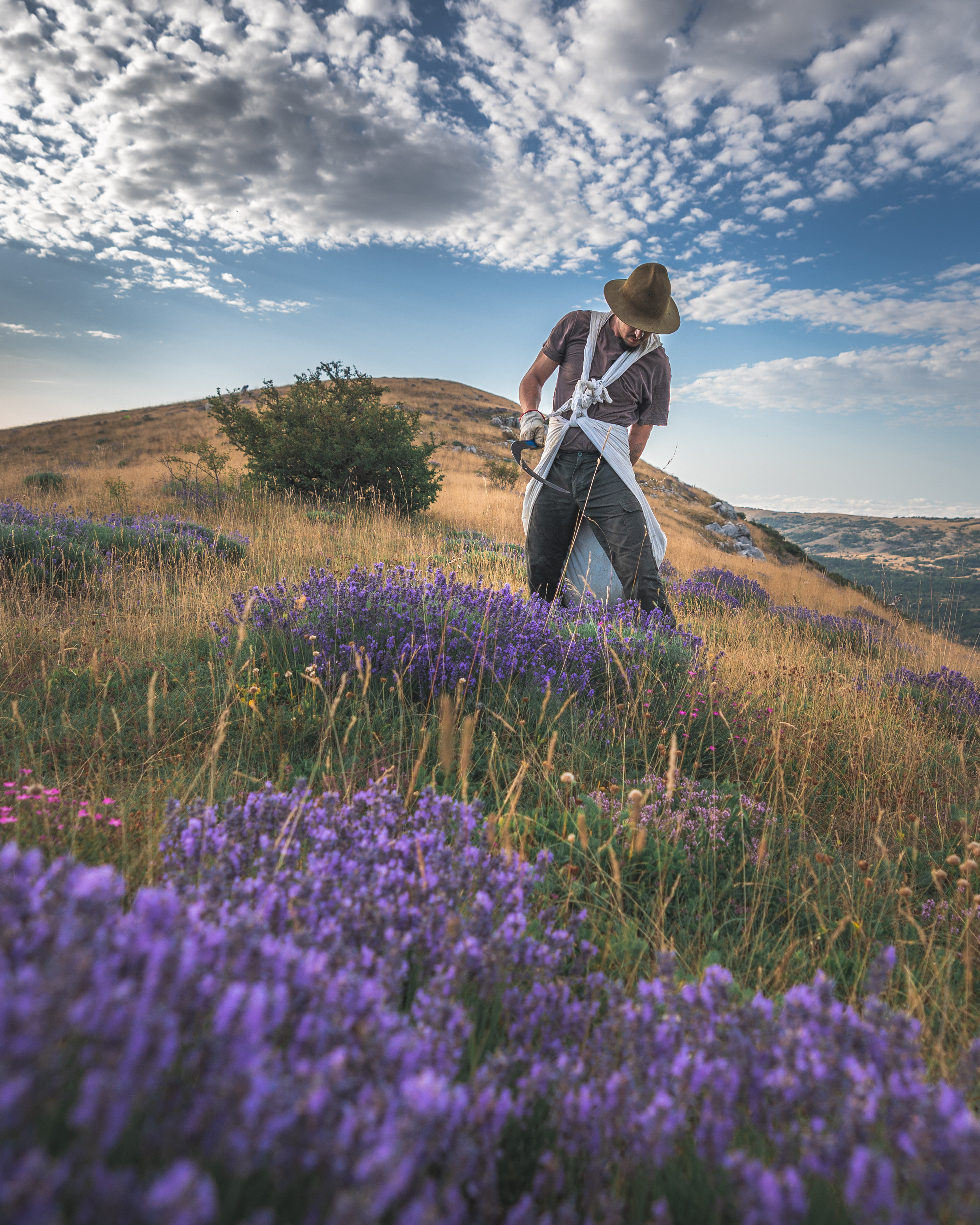 The harvest period starts in July, when plants are in full bloom. The traditional picking is performed by hand, using sickles sharpened about 4 times a day, including in the morning before the picking starts at around 7am. Technical and crucial for the following year's harvest, this process requires a precise gesture that involves cutting the flowers without damaging the plant to allow it to grow well afterwards. Pickers are especially attentive to cut the flowers cleanly and evenly while adopting a certain position that preserves their physical condition and does not tire their wrists, joints or backs.
