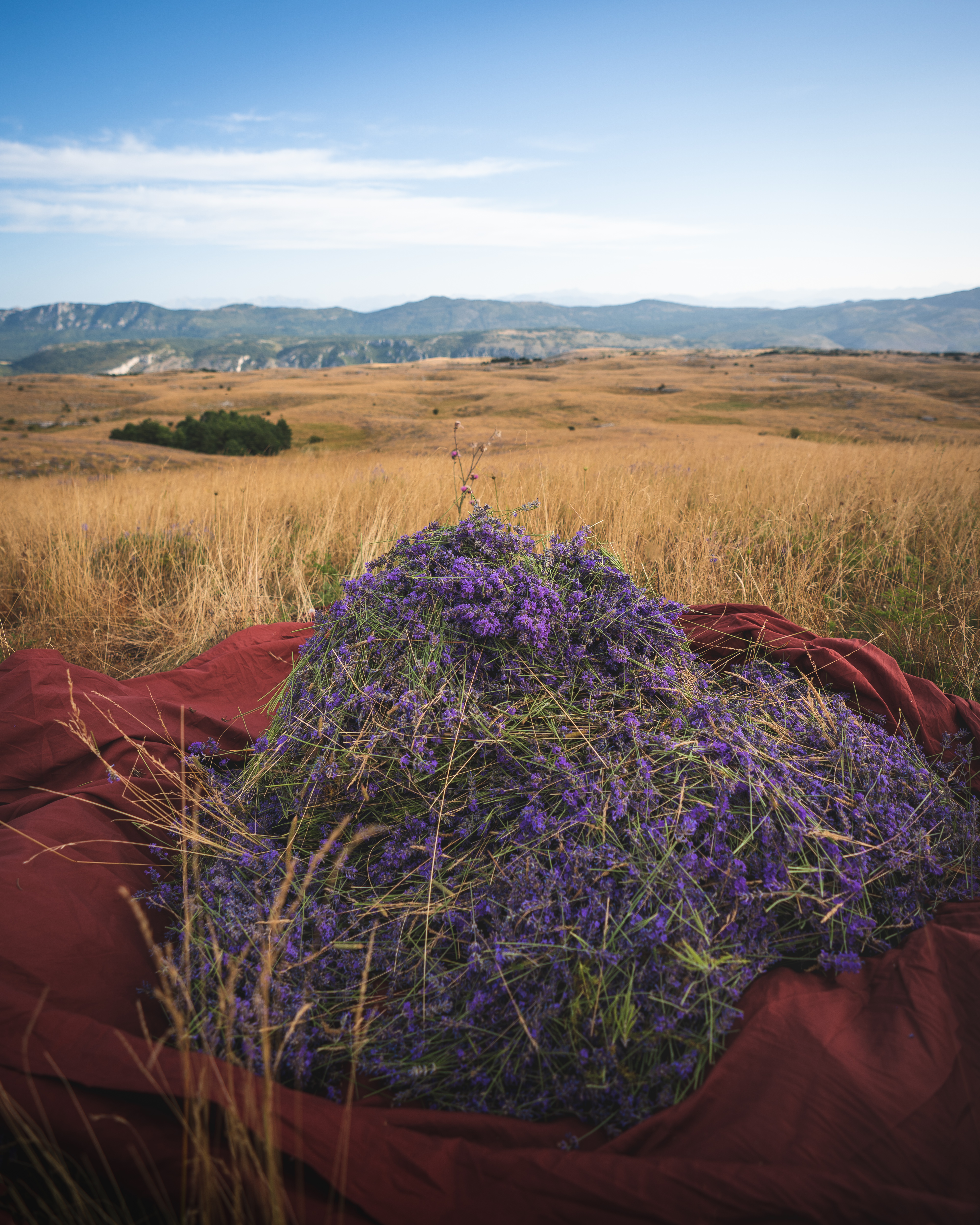 A true art, this ancestral know-how is transmitted among pickers from year to year. Hand-picking is also combined with an ancient technique of a large sheet crossed in the back, and in which the cut lavender is collected. Gradually, these sheets filled with plants are emptied into other large sheets placed on the ground. Tied at each corner, the bundles thus formed allow plants to be harvested in large quantities, up to about 90 kilograms, and to preserve their essence. Collected just a few hours later in the wild hills of the Plateau de Caussols, the freshly harvested flowers are directly transported to our distillery where our organic and 100% natural Essential Oil and Hydrosol of Lavandula angustifolia are produced with special care and according to the Florihana distillation process at very low temperature.
