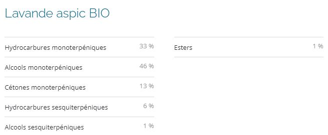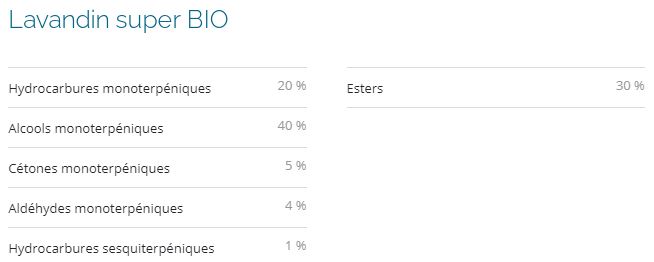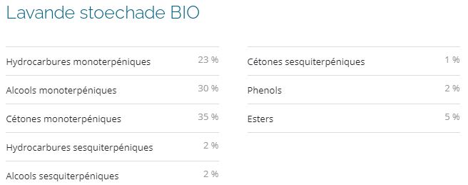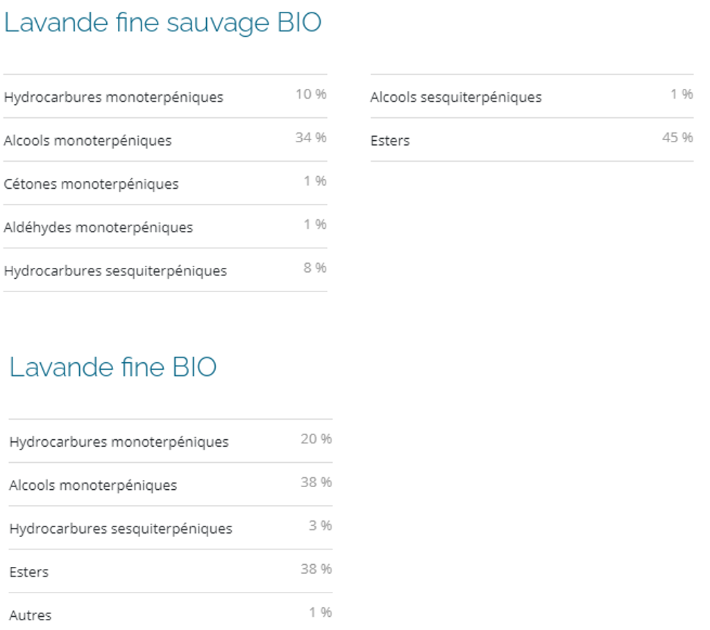 Profils biochimiques: D’après leur composition, ces variétés de lavandes se révèlent notamment riches en Esters aux nombreux bienfaits tels que rééquilibrants et apaisants, ainsi qu’en alcools et hydrocarbures monoterpéniques réputés anti-infectieux entres autres propriétés.